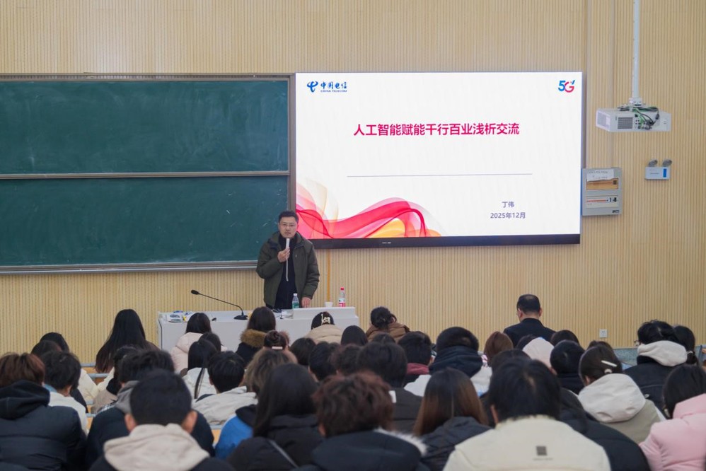 2025年12月12日,智能信息学院“人工智能与产业发展”专题讲座在骛新楼209教室举办。本次活动特邀南通电信开发区局局长、学院产业导师丁伟担任主讲嘉宾,电信服务与管理专业三个年级120余名学子现场聆听,学院党总支书记陆永来、院长夏洪星及3位电信班辅导员出席。 活动伊始,陆永来介绍了丁伟局长在电信行业深耕多年的实战经验与职业成就。作为与学院紧密合作的产业导师,丁局长不仅深度参与电信服务与管理专业课程设计、实训基地建设,更长期为学生提供职业规划指导、就业岗位对接等实际支持。陆书记鼓励同学们珍惜与行