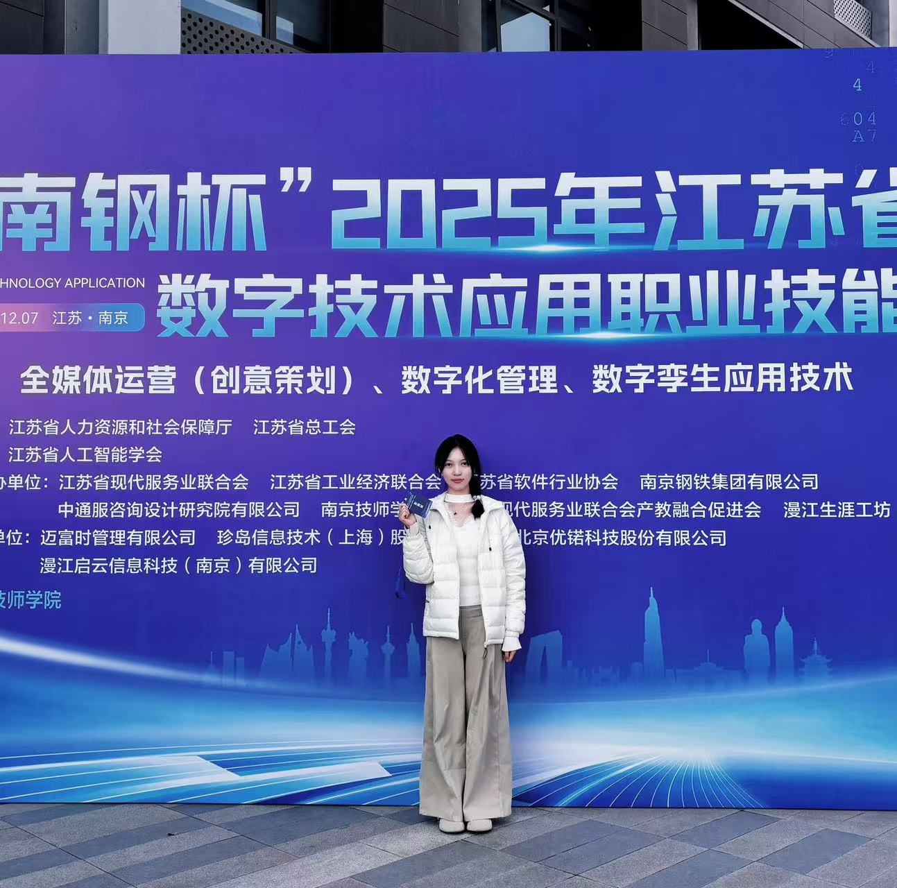 2025年12月7日,江苏省数字技术应用职业技能竞赛在南京技师学院隆重举行并圆满落幕。本次竞赛为省级一类赛事,设有全媒体运营(创意策划)、数字化管理、数字孪生应用技术三大赛项,均为个人赛。全省各地市经过层层选拔,共有2000余名选手参与初赛,最终293名选手晋级省赛。 本次竞赛以个人赛形式开展,全面考察选手独立的专业技能、创新思维和实战能力。我校管理学院王文静老师指导的王月同学、陆双双老师指导的金思情同学在全媒体运营(创意策划)(学生组)赛项中分别取得二等奖、三等奖的好成绩。两位同学的出色
