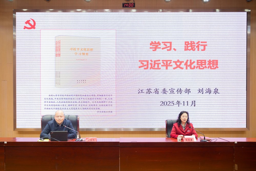 11月25日,我校“领导干部上讲台讲思政课”活动成功举行。本次活动特邀江苏省委宣传部原机关党委副书记刘海泉担任主讲,以“学习、践行习近平文化思想”为题,为全校师生带来一堂内涵丰富、思想深刻的思政金课。学校党委书记陈玉君主持活动。 授课过程中,刘海泉从习近平文化思想的形成与提出、产生的时代背景、主要内容以及当代青年如何承担新的文化使命等多个维度,对习近平文化思想进行了系统梳理和深入浅出的解读。他首先厘清了文化与文明的内在关系,继而清晰梳理了习近平文化思想的形成脉络与时代背景,并重点围绕