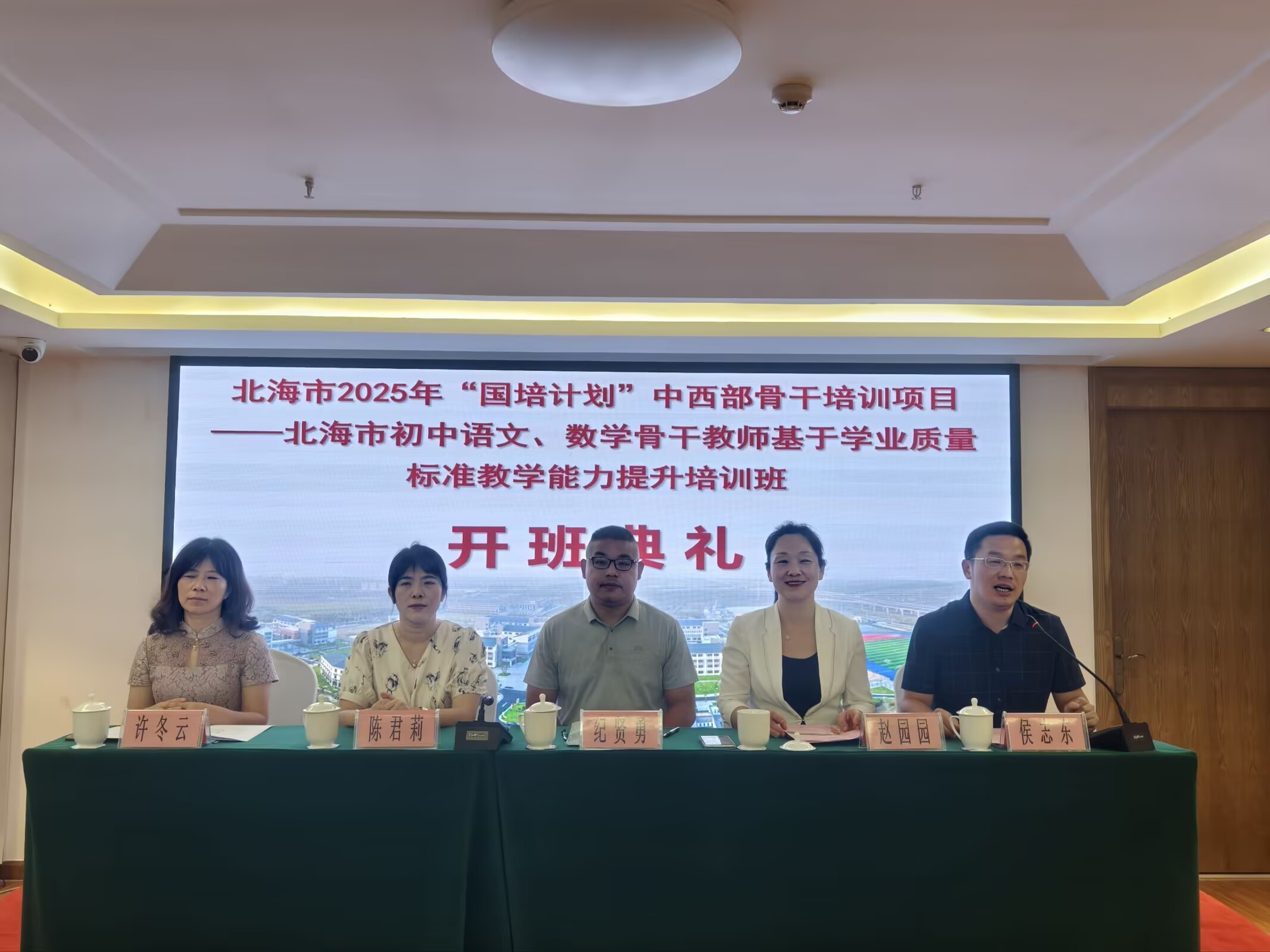 近日,由北海市教师培训中心主办、我校承办的北海市2025年“国培计划”中西部骨干培训项目——北海市初中骨干教师基于学业质量标准教学能力提升培训班圆满结束。来自北海市各县区的初中语文、数学、英语骨干教师150余人参加了培训。 本次培训以聚焦学业标准,锤炼命题与教学实战能力为主题,聚焦“教学—命题—评价”一体化能力提升,以提升基于学业质量评价标准的命题能力及教学能力为目标,通过集中培训、跟岗研修、返岗实践等方式,帮助参训学员把握评价改革趋势,掌握命题方法与策略,基于评价结果优化课堂教学,带动