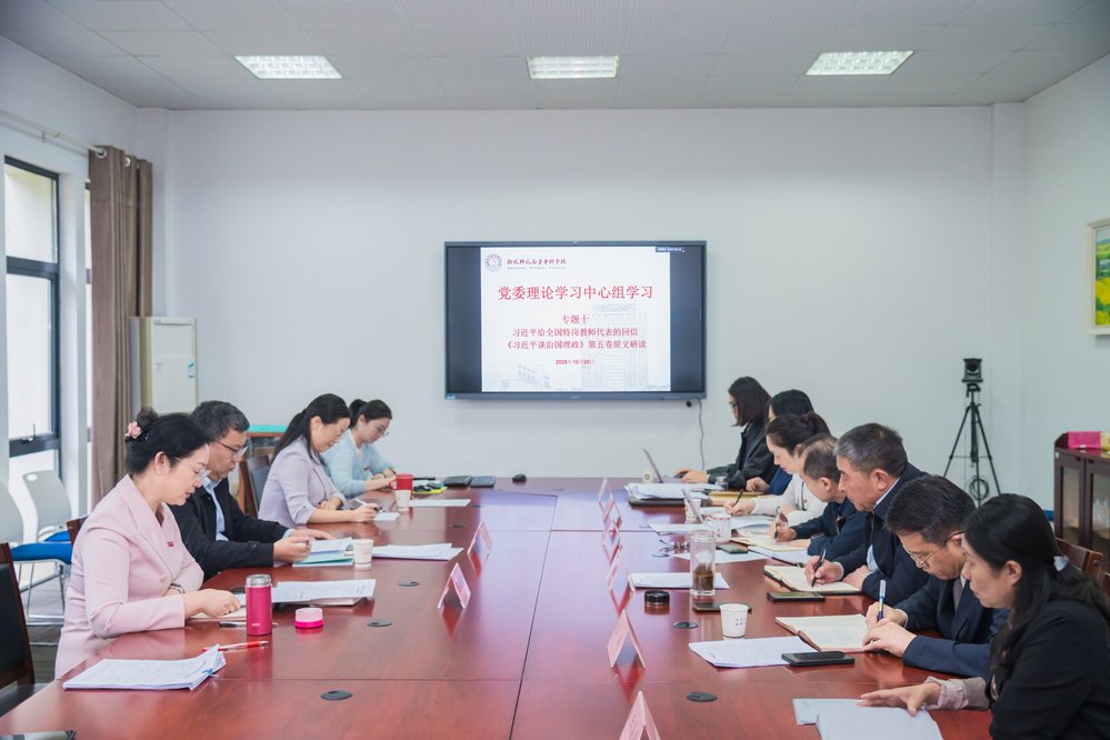 2025年10月20日,学校党委理论学习中心组举行2025年第10次专题学习会,专题学习《习近平谈治国理政》第五卷和习近平总书记给全国特岗教师代表的回信。党委书记陈玉君主持学习会。 校党委理论中心组成员岳峰领学,会议集中学习了《习近平谈治国理政》第五卷的核心要义,并传达了上级部门关于做好该卷学习教育工作的通知精神。会议还认真学习了习近平总书记给全国特岗教师代表的回信,回信充分体现了党中央对广大教师和教育工作者的殷切关怀与高度重视。 结合学校实际,会议就贯彻落实学习内容提出明确要求: 一要