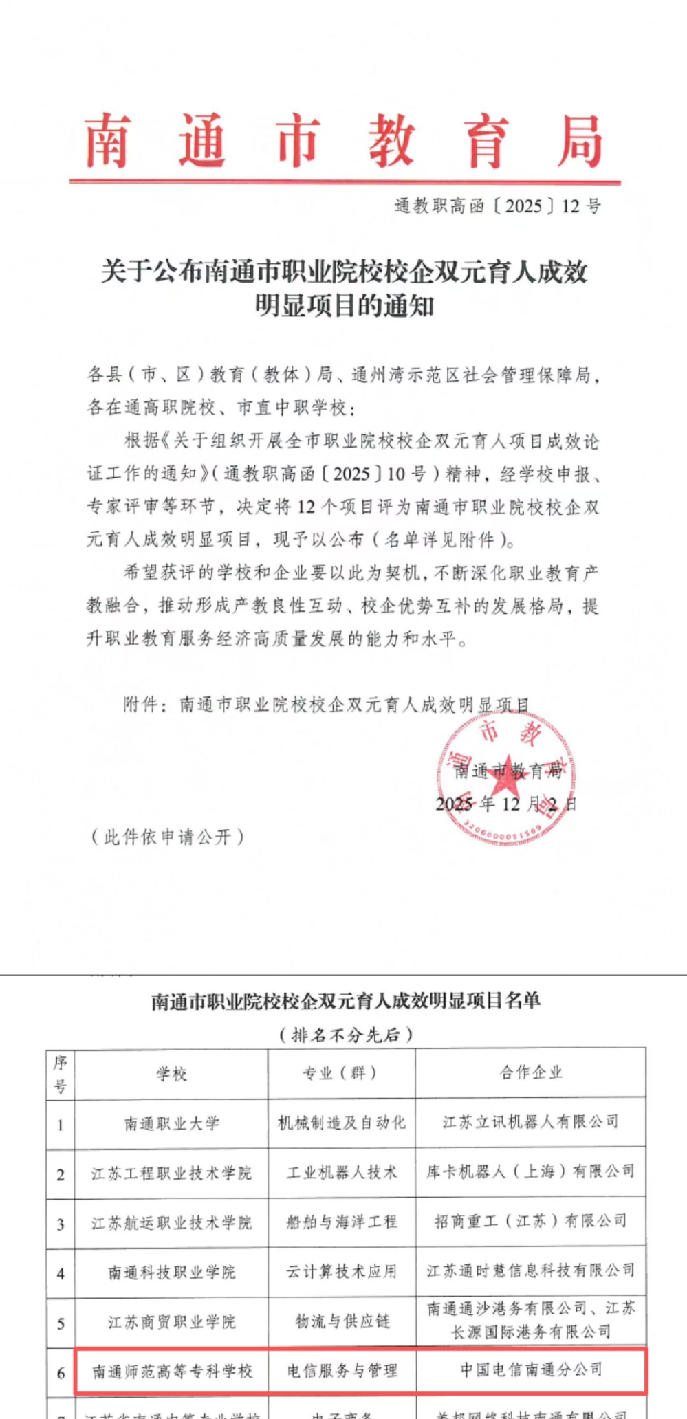近日,南通市教育局发布了《关于公布南通市职业院校校企双元育人成效明显项目的通知》,智能信息学院院电信服务与管理专业凭借突出的校企合作成果及育人实效,入选该名单。这一荣誉标志着我校在深化产教融合、推动校企协同育人方面取得了阶段性显著成效,获得了政府部门的正式认可。 电信服务与管理专业是我校与江苏电信南通分公司合作的校企共建专业。近十年校企合作期间,双方以“资源互补、协同共赢”为核心,在人才培养、师资建设、社会服务、教科研发展等领域深耕细作,取得一系列扎实成果,为双元育人示范项目奠定了深厚实践基础。